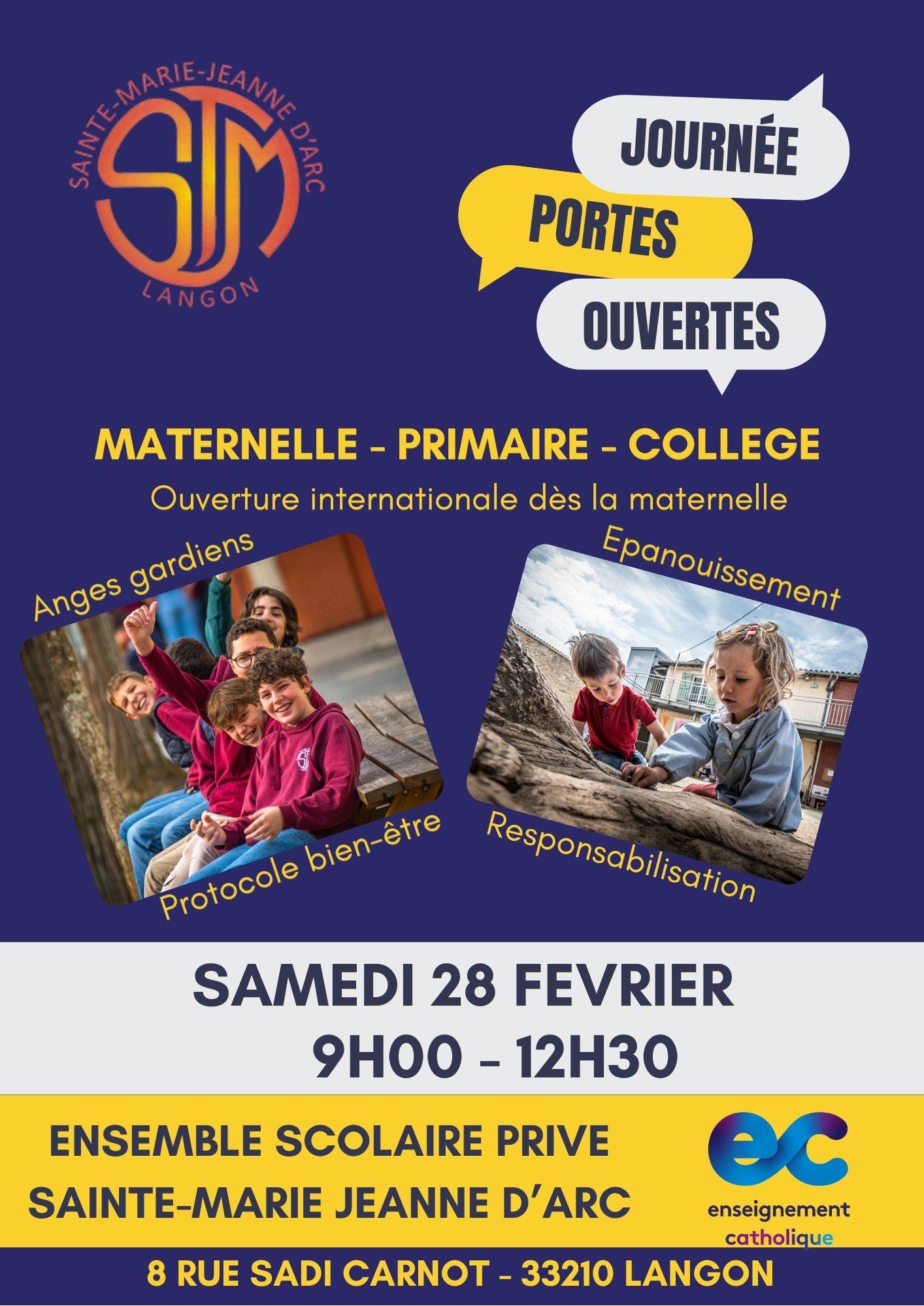 De la maternelle au collège en passant par l’élémentaire, L’Ensemble Scolaire Ste Marie Jeanne d’Arc propose un véritable parcours de progression pour votre enfant.